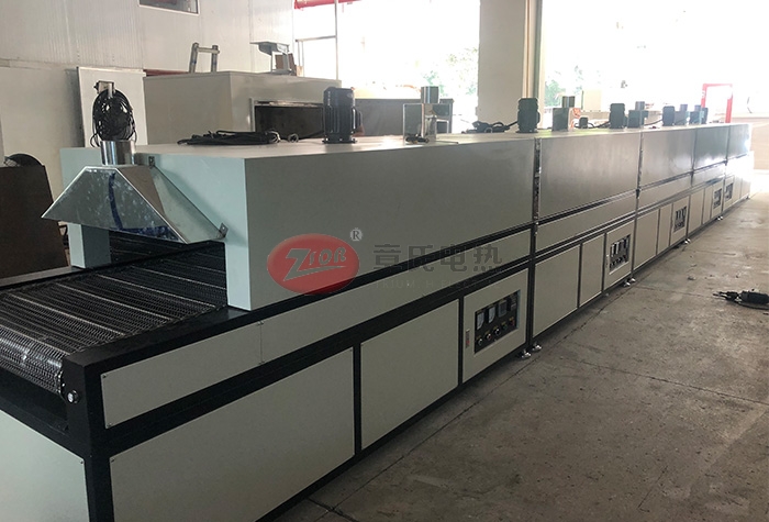 1、爐部分外形尺寸:線體總長12米,網帶寬1.0米,總高1.6米,出料部分長1米,烘干部分長10米,分為5段,進料部分長1米,冷卻區為0.4米,線體大梁支架和箱體外殼采用2.0㎜厚冷板折彎而成,整機外殼高溫靜電噴塑(非普通油漆)耐腐蝕易清洗,機架用50×50㎜方通焊接而成,配16㎜調節腳杯。